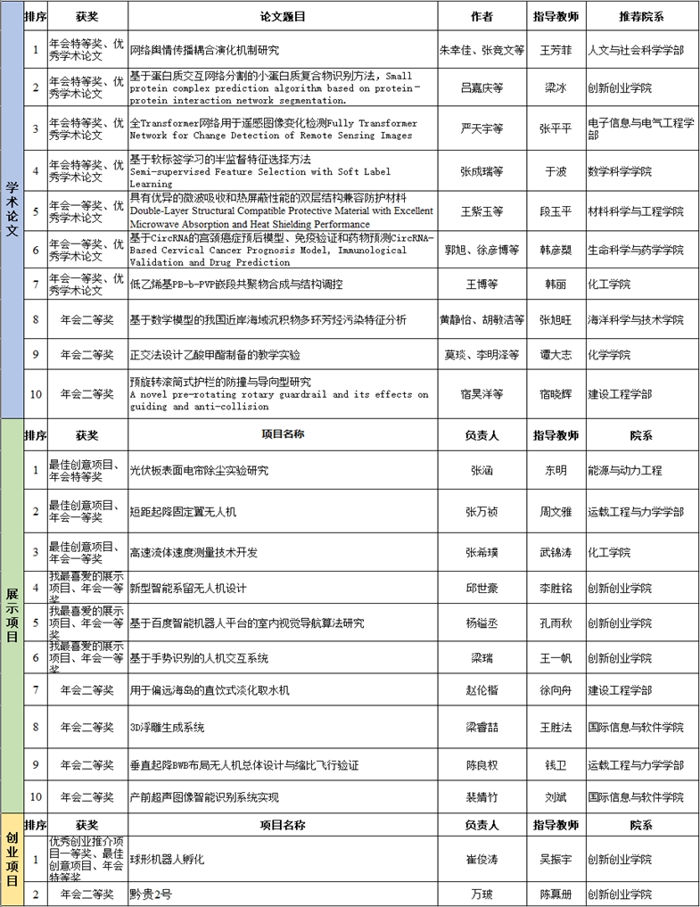 本次年会经过学校推荐申报、专家组初评、省创指委专家复审、会审等环节,共有457项作品入选年会进行现场交流和展示,代表了全省各高校最新最高的创新创业教育成果。我校人文与社会科学学部王芳菲副教授指导、本科生朱幸佳撰写、张竞文汇报答辩的论文《网络舆情传播耦合演化机制研究》获年会特等奖,并作为优秀学术论文代表在年会闭幕式以主题报告形式展示项目研究成果。