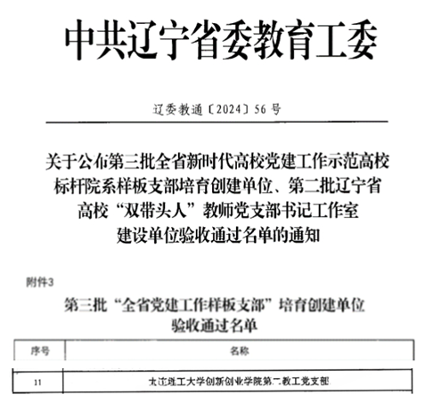 近日,中共辽宁省委教育工委公布获评第三批全省新时代高校党建工作示范高校标杆院系样板支部培育创建单位验收通过名单。学院创新实践研究生导师纵向党支部(原第二教工党支部)顺利通过第三批“全省党建工作样板支部”培育创建验收。
