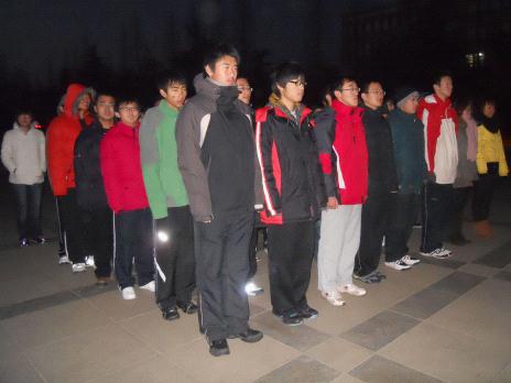 清晨6点20分,天还没有亮,创新实验学院10级全体同学已准时到场。尽管现在是深冬季节,天气寒冷,同学们仍能整齐地站好队伍,等待着升旗仪式的开始。
