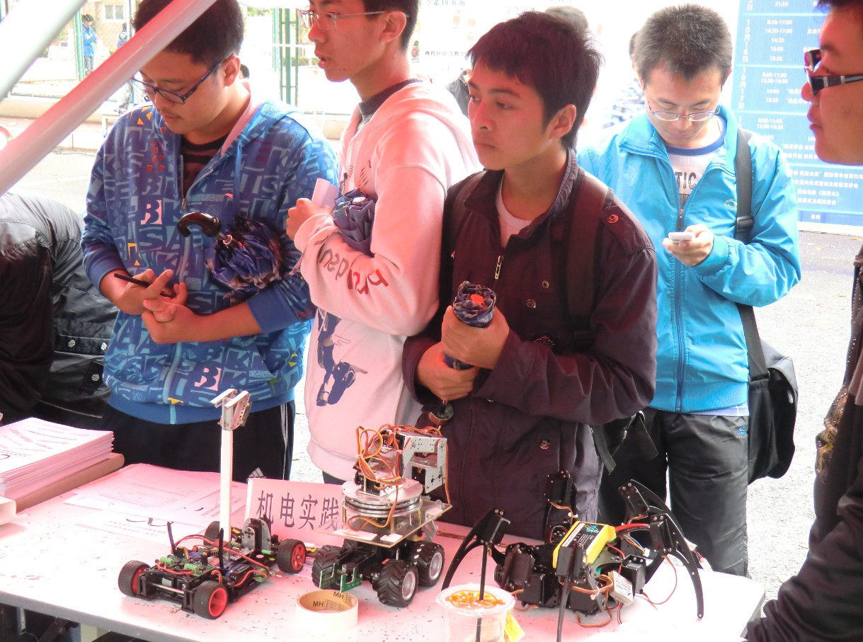 各个实践班针对自身的特点,进行了异彩纷呈的展示,体现了实践班的风采。机电实践班还将智能车拿到招生现场,让同学们更加直观的了解每个实践班的特色。尽管报名首日有风雨的阻挡,但招生现场仍十分火爆,同学们都踊跃报名,以免错过这次机会。