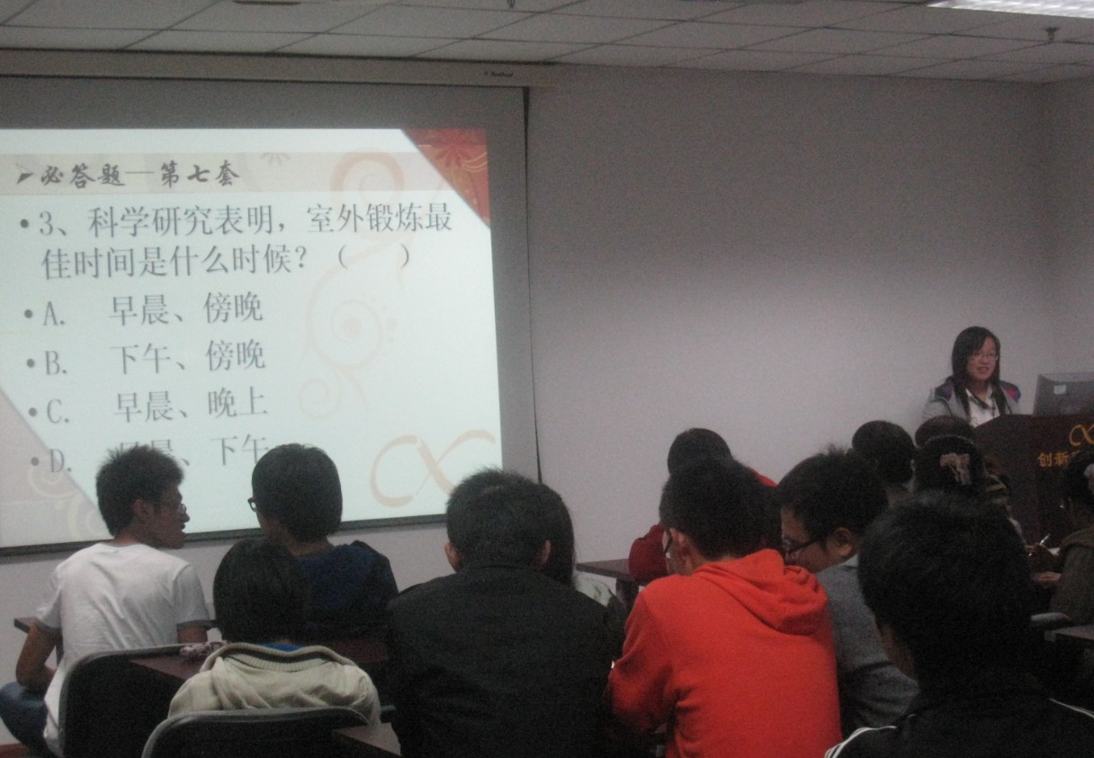 晚六点,比赛正式开始。比赛共分三个环节:必答题、判断题与风险题。必答题比拼基础知识,判断题争分夺秒,风险题惊险刺激。整场比赛环环相扣,气氛紧张而不失活跃。比赛选手为三人一队,各队之间你争我赶,竞争激烈。