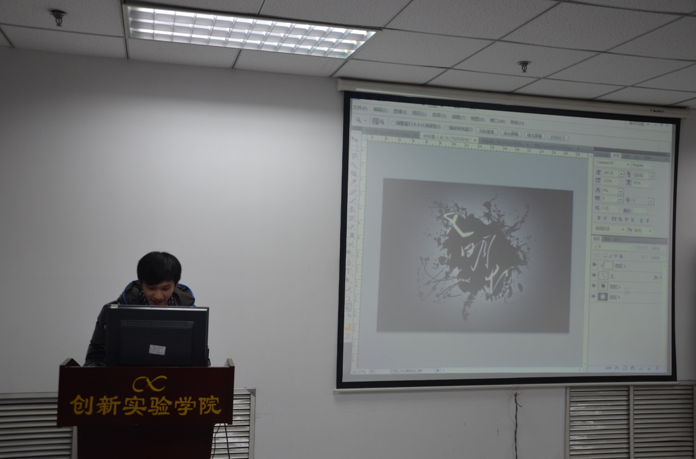第四讲是由创新实验学院美宣部部长金贺啸主讲的《PhotoShop应用与操作》。讲解中联系生活中的photoshop,让同学们了解到photoshop在生活中的广泛应用。此次他主要讲解了logo的制作问题,在金贺啸同学的操作下,几个普通的字瞬间便变得美仑美奂,变成了大家常见的logo。金贺啸用高超的技术,幽默的语言抓住了在场同学们的注意力。同学们在惊叹于Photoshop的功能强大的同时也学到了不少技术。