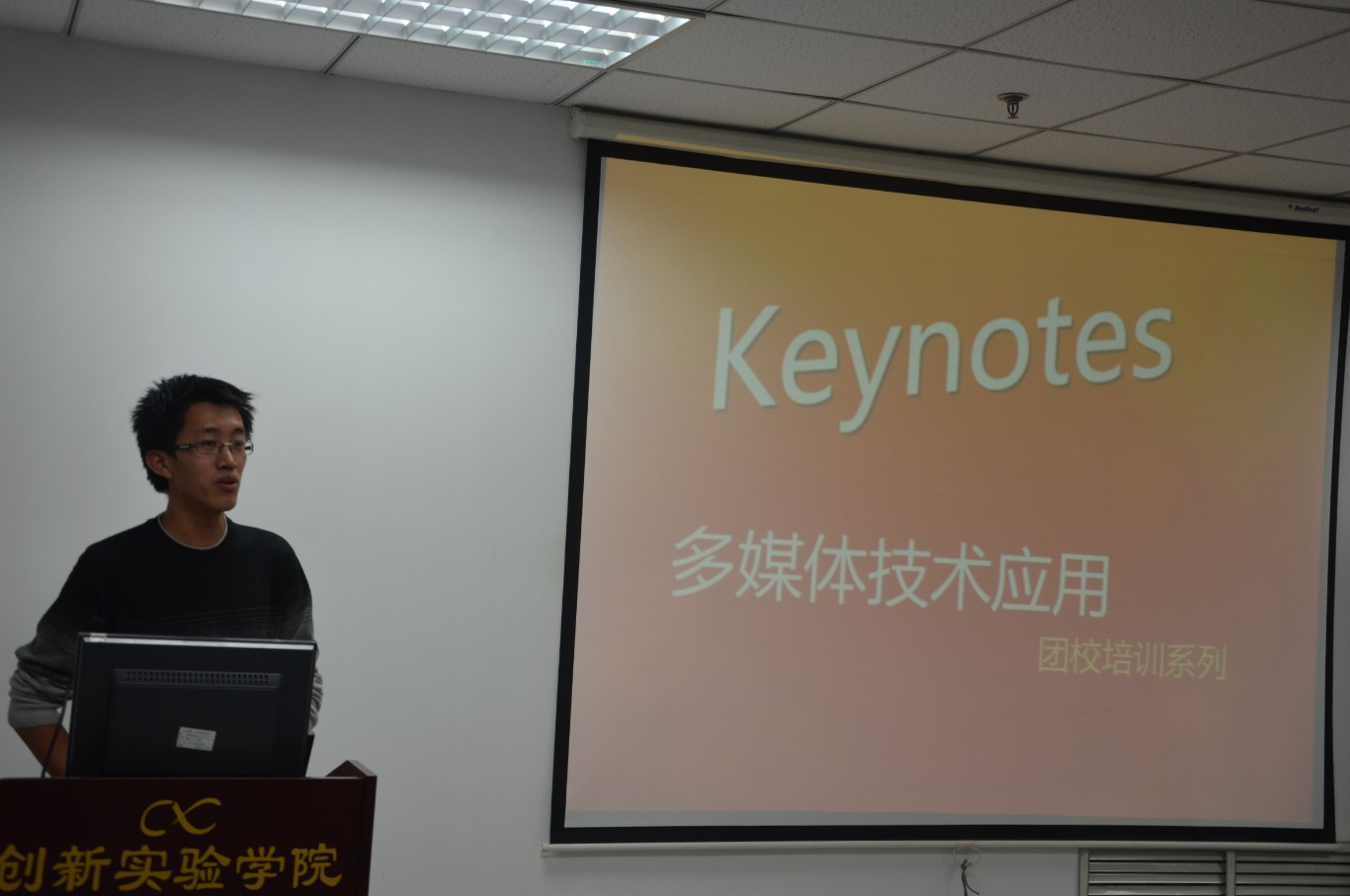 观众在晚上六点有序入场,培训准时开始。首先由徐晓宁同学进行第三讲《多媒体技术应用》的讲解。在这一讲中,徐晓宁同学介绍了各种常用的演示软件及演示方法和一些在进行演示中需要注意的问题,剖析了常见的误区,教授了许多便捷的用法,并与大家分享了他在近年的汇报中所积累的经验。整个过程由浅入深,同学们响应积极。