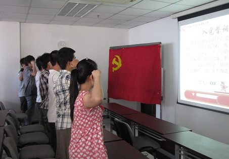 7月10日下午两点,创新实验学院学生党支部在研教楼920室举行了“庆祝建党九十周年”主题活动暨2011年新党员宣誓仪式。支部的所有党员参加活动。