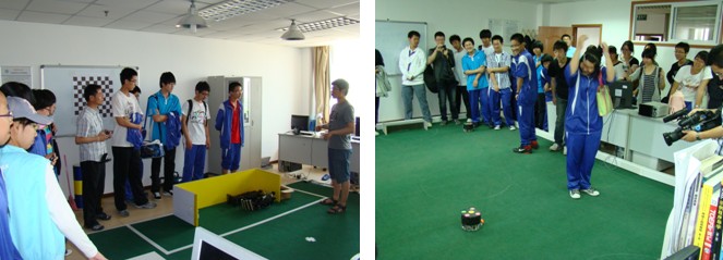随后,学生们来到创新实验学院创新实践基地,参观了智能车、人形机器人、轮式机器人等实验室。贺明峰副院长、孙焘副教授、潘秋惠老师、杜猛老师、姚翠莉老师以及优秀研究生代表,用高中生可理解的方式对每一个实验室做了详细的介绍,并回答了学生提出的问题。学生们对各个实验室都表现出了浓厚的兴趣,被我院为学生提供的优质创新教育平台所吸引。大连市第一中学的带队教师非常满意此次活动,并表示希望下一步能与我院合作,激发中学生的创造潜力,丰富高中的教育教学模式。
