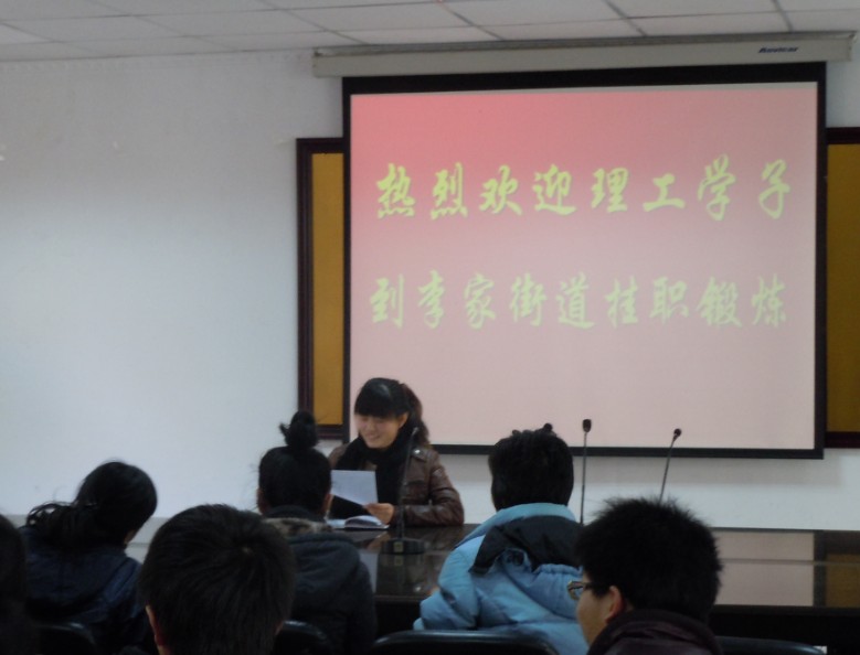本次会议由李家街道团委负责人张艺赢主持,街道各个社区的代表均出席。会上,团委负责人首先对同学们的到来表示了欢迎和感谢,然后向同学们介绍了社区工作的形式和内容,希望同学们能在此次社区挂职中得到充分的锻炼和提高,用自己的知识和热情为社区注入新的活力,并对同学们将要进行的社区工作寄予了希望。