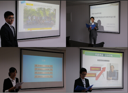 在历时将近2个小时的评审过程中,学院2012级、2013级的八个班级依次做了精彩的展示。各班级总结了上一年度的学风建设情况和取得的成绩。班级同学集思广益,群策群力;班委肩负责任,认真组织。“一对一”学习辅导,以小组为单位的自主学习、学习资料的网络共享、错题解析与探讨、短期模拟测试等等活动搞得有声有色,真正促使每个同学养成良好的学习习惯,营造良好的班级学习氛围。与此同时,各班也积极开展了丰富多彩的班级活动,联络了同学间的感情,增强了班级的凝聚力。