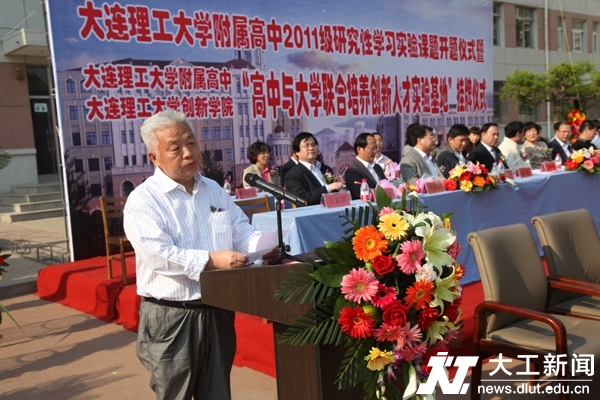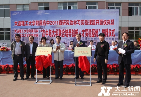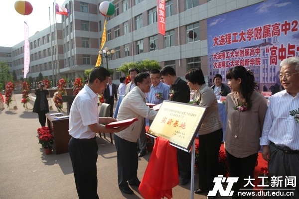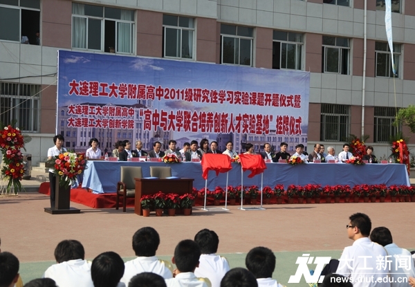 5月18 日下午,我校附属高中与创新实验学院联合培养创新人才实验基地挂牌庆典在附属高中操场隆重举行。标志着辽宁省首家普通高中与大学联合培养创新人才实验基地正式诞生,意味着我校附属高中依托大学资源,探索大学与高中课程有机衔接、大学与高中合作培养创新人才的可行模式正式进入运行阶段,同时也标志着附属高中在探究素质教育之路上又迈出一大步。附属高中2011级研究性学习实验课题也在仪式上正式开题,包括我校校长欧进萍院士、原校长程耿东院士、常务副校长郭东明院士在内的35位专家、教授正式受聘担任“创新人才培养基地”顾问,指导附属高中同学进行研究性学习。