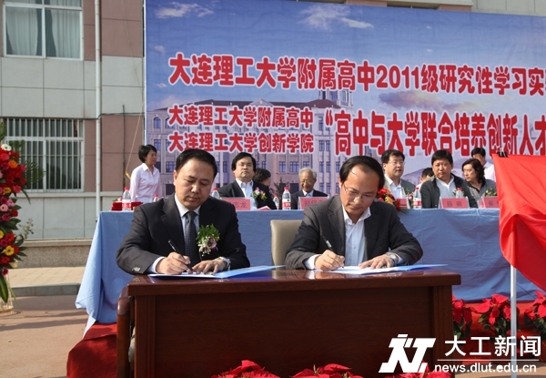 仪式上,附属高中校长王跃进、创新实验学院院长冯林共同签署“大连理工大学附属高中与大连理工大学创新实验学院联办创新人才培养基地协议”。在热烈的掌声中,与会领导共同为实验基地揭牌。