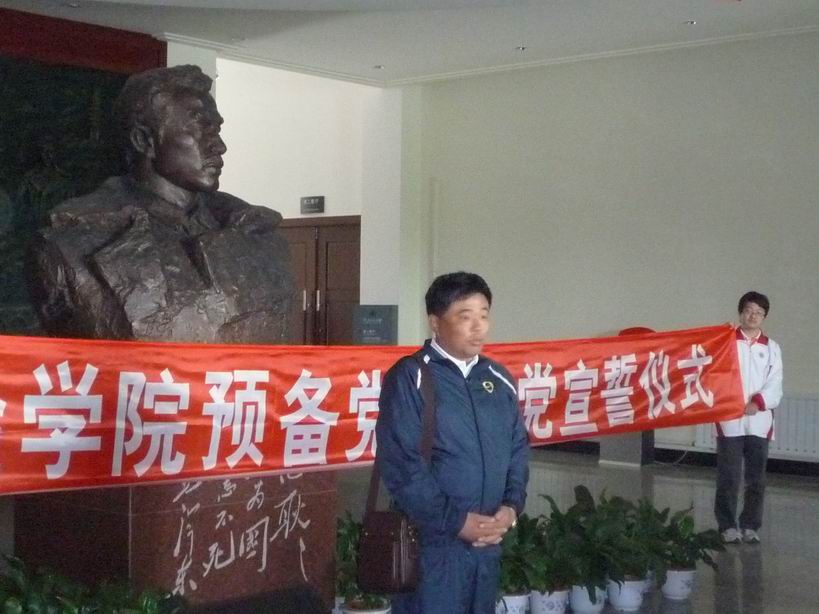 仪式在雄壮的《国际歌》中拉开序幕。新党员面向党旗,高举右手,在学院学生会主席刘伟国的带领下,郑重地宣读了入党宣誓词。