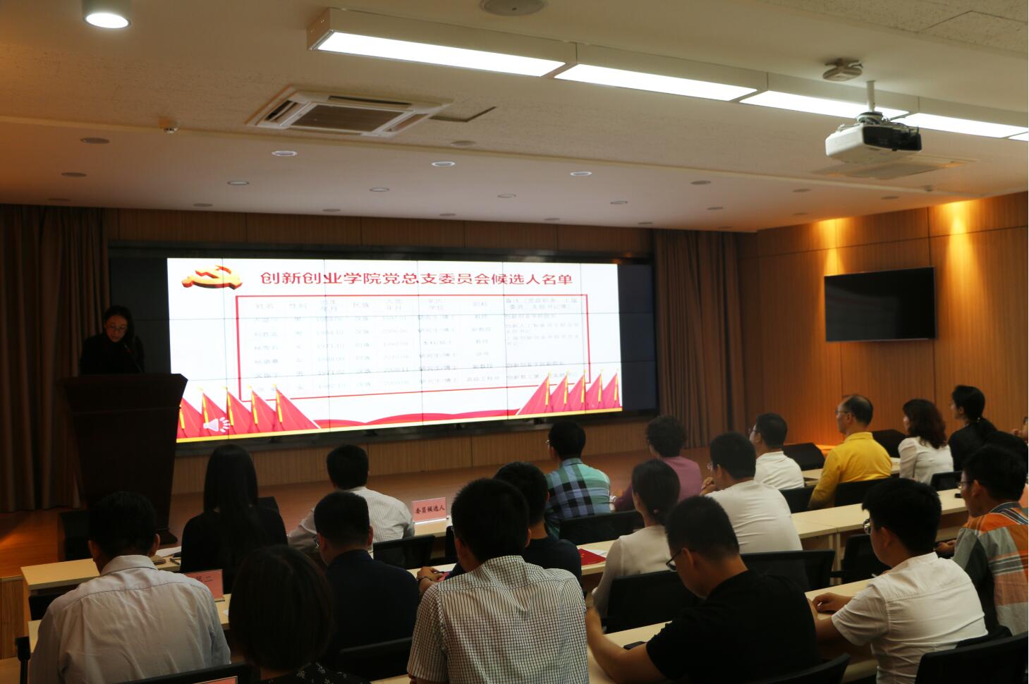 总监票人冷楠逐一介绍新一届创新创业学院党总支委员候选人情况,计票人清点并向大会报告党员代表人数,监票人当众检查票箱,加锁封箱。大会按照《选举办法》进行了正式选举,以差额选举、无记名投票的方式进行,每个党员都投出了自己神圣的一票。投票完毕后,监票人和计票人在计票室进行唱票、计票。