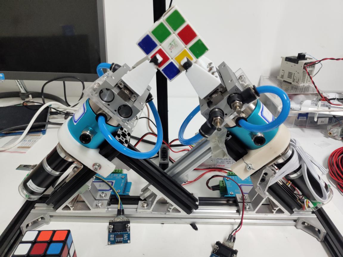 机器人创意竞技类还是以“魔方机器人”为主题,但今年的比拼异常激烈。我校解魔方机器人作品在第一代的基础上缩小了整体尺寸,并改进了夹取的结构,采用了快速气动的方案,机械性能有了很大提升。但对光线的变化适应能力还不够强,导致在赛场的复杂光线条件下影响了识别准确度,最终只遗憾地获得三等奖。