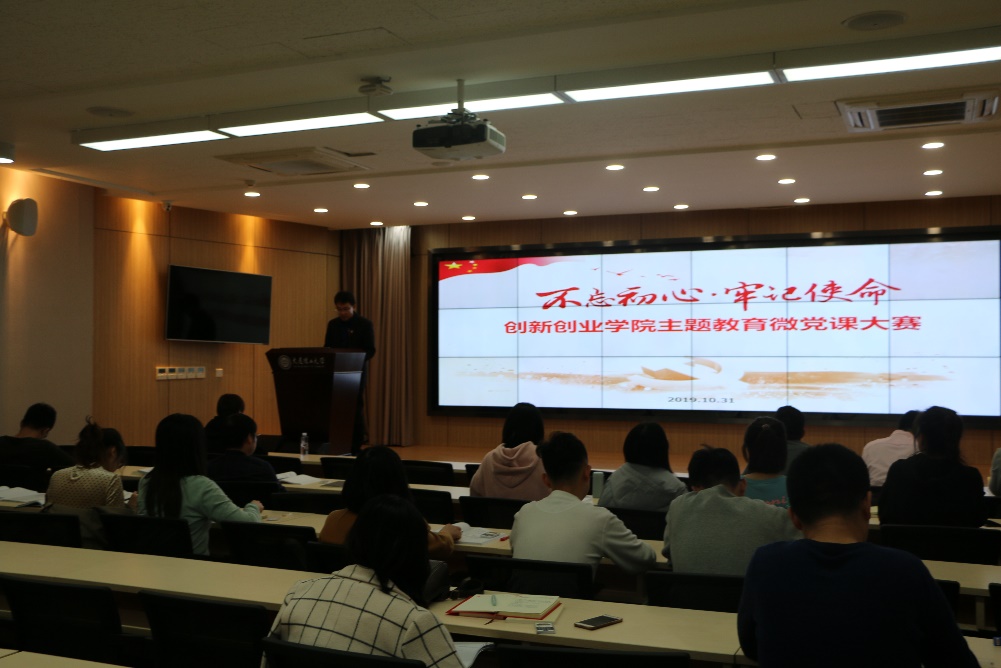 10月31日下午,创新创业学院党总支在太库报告厅举办主题教育微党课大赛,学院党支部书记纷纷走上讲台汇报交流主题教育学习成果。学院全体党员参加学习并担任评委。学院五位党支部书记以此带来了《中国特色社会主义进入新时代》《坚持一国两制和推进祖国统一》《掌握马克思主义思想方法和工作方法》《推动社会主义文化繁荣兴盛》《探寻初心之路》等五场精心准备的。经过台下的全体与会党员的打分评议,来自第一教工党支部的张崴老师获得第一名。