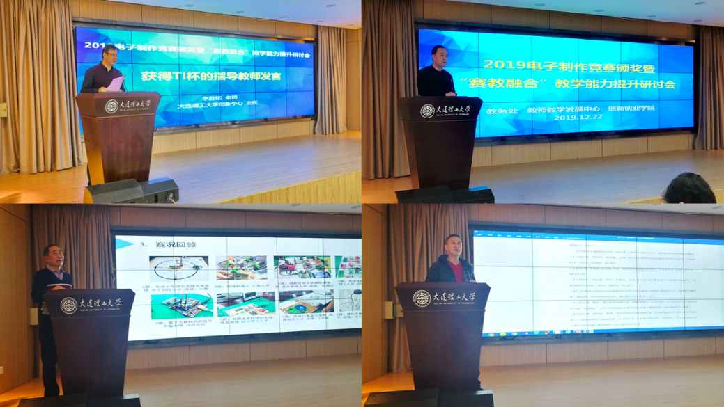12月22日,为进一步分析如何开展以创新创业竞赛为抓手,深入开展“赛教融合”式教学改革,提升教师的“专创融合”教学能力,为学科和专业建设做好支撑,切实发挥竞赛的重要作用,由创新创业学院、教师教学发展中心和教务处主办的2019电子制作竞赛颁奖暨“赛教融合”教学能力提升研讨会在创新创业学院太库报告厅举行,教师教学发展中心主任冯林教授、教务处副处长徐立昕教授、全国电子设计竞赛责任专家金明录教授、信通学院院长王洪玉教授、软件学院副院长王雷教授、电工电子中心主任王开宇教授、电气工程实验中心主任孙长海教授、信通技术实验中中心主任解永平副教授出席会议,电子制作竞赛的评审专家及部分电子设计竞赛的相关指导教师也出席了本次会议,会议由创新创业学院副院长吴振宇教授主持。