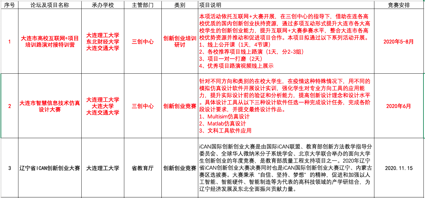 大连市创新创业教育联盟本年度拟开展12个项目,其中2个项目为大连市三创中心主导,其他项目由联盟成员7所高校根据自身特色分别承担。作为合作重点项目之一的大连市高校互联网+培训路演对接特训营由大连理工大学、东北财经大学、大连交通大学合作承办。本项活动是依托互联网+大赛开展的培训研讨。在三创中心的指导下,大连理工大学创新创业学院借助在连各高校优质的国内创新创业扶持资源,通过多项互动形式提升大连市各大高校学生的创新创业能力,提升互联网+大赛参赛水平,整合大连市各高校优势资源并推动和促进项目合作。此项合作旨在改变之前大连各个高校单打独斗备战竞赛的情况,提升大连市高校间凝聚力。针对疫情期间的特殊情况,创新创业教育联盟将举办大连市智慧信息技术仿真设计线上竞赛作为合作项目的第二个重点。此项目由大连理工大学、大连大学、大连交通大学承办。针对不同方向和类别的在校大学生,在疫情期间,用不同的模拟仿真设计软件开展设计实训,强化学生对专业方向工具的应用能力,提升实际设计前的验证和分析能力,提高创新设计理念和设计水平,保证疫情期间教育培训不断线。大赛设计工具分为Multisim仿真设计,Matlab仿真设计,企业经营模拟应用三种,覆盖面更广,使更多的学生参与该项赛事,让学生居家也有机会参与创新创业实践活动,锻炼和提升创新创业能力。
