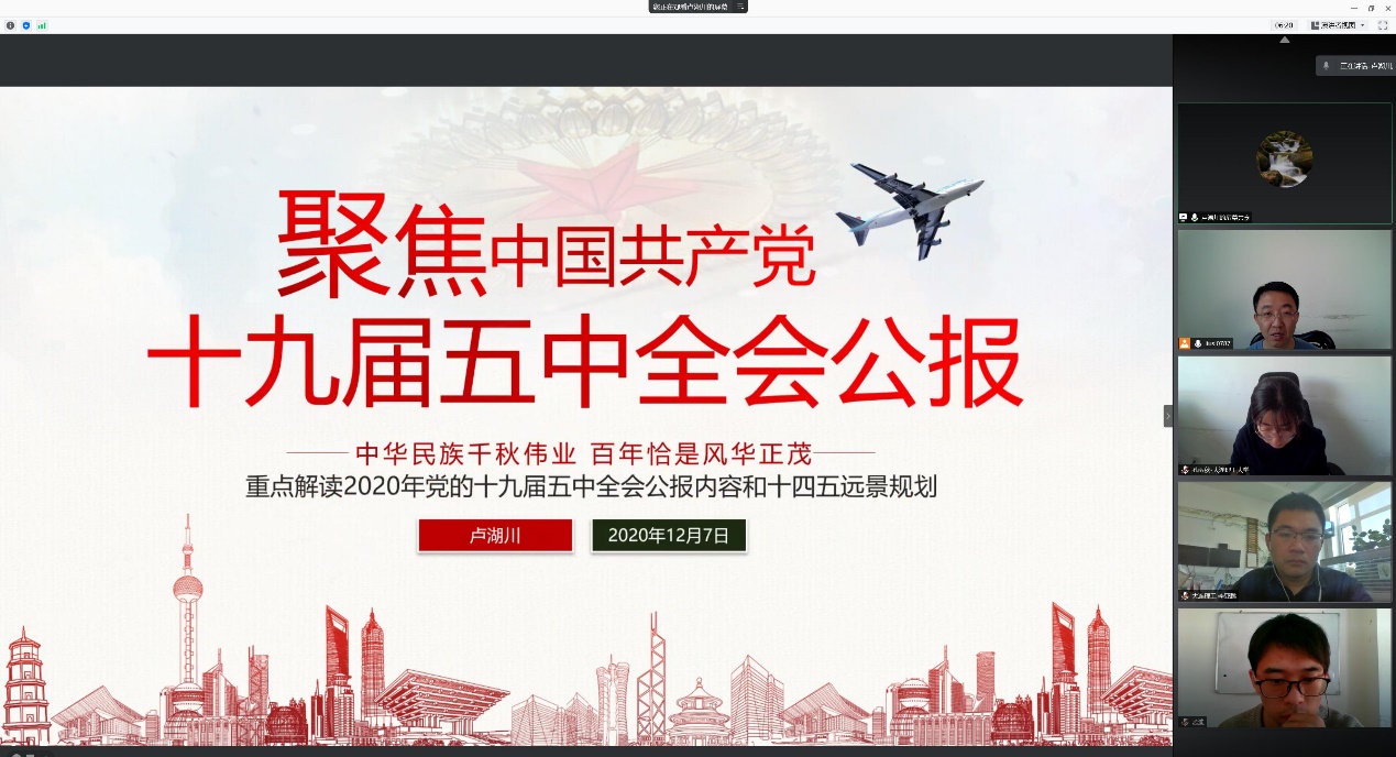 党的十九届五中全会全面贯彻习近平新时代中国特色社会主义思想和党的十九大精神,在全面建设社会主义现代化国家新征程即将开启的重要历史时刻,对“十四五”及中长期我国经济社会发展做出了系统谋划和战略部署,充分体现了以习近平同志为核心的党中央谋划未来的远见卓识和继往开来的历史担当,充分反映了我们党团结带领人民接续推进“两个一百年”奋斗目标的坚定信心和坚强决心,在党和国家发展进程中具有全局性、历史性意义。卢湖川从四个方面解读了全会精神。其一介绍了大会概况;其二精讲解读大会公报;其三介绍了公报内容14个关键词;其四对全会公报30个重点名词解释。