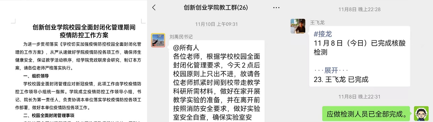 学院坚持把疫情防控作为当前重要的工作,从严从速跑出防控工作“加速度”。学院召开党政联席会,讨论了疫情防控工作和线上开展双创工作议题,制定《创新创业学院校园全面封闭化管理期间疫情防控工作方案》,进一步加强学院内部治理,保障学院发展不停步。学院及时传达大连市和学校疫情防控要求,做好师生思想政治工作;连夜紧急联系教师全员按时完成首轮核酸检测,筑牢疫情防控基础;第一时间联系教师入校备份资料,做好封校期间工作准备。学院在校值班人员迅速主动到位进入“战时角色”。