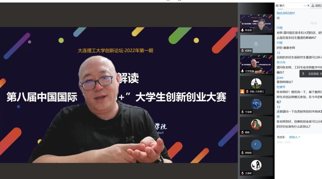 2022年4月4日晚,由教务处、创新创业学院主办的“深度解读第八届中国国际‘互联网+’大学生创新创业大赛”专题讲座暨2022年第一期大连理工大学创新论坛在线上举办。讲座嘉宾、教育部创新创业教育指导委员会副秘书长张强针对我校“互联网+”大赛备赛工作做专题辅导,创新创业学院院长兼教务处副处长卢湖川教授代表学校致辞,全校520余名师生通过腾讯会议和线上直播平台参与讲座,并与嘉宾进行了线上互动。讲座由创新创业学院副院长吴振宇教授主持。