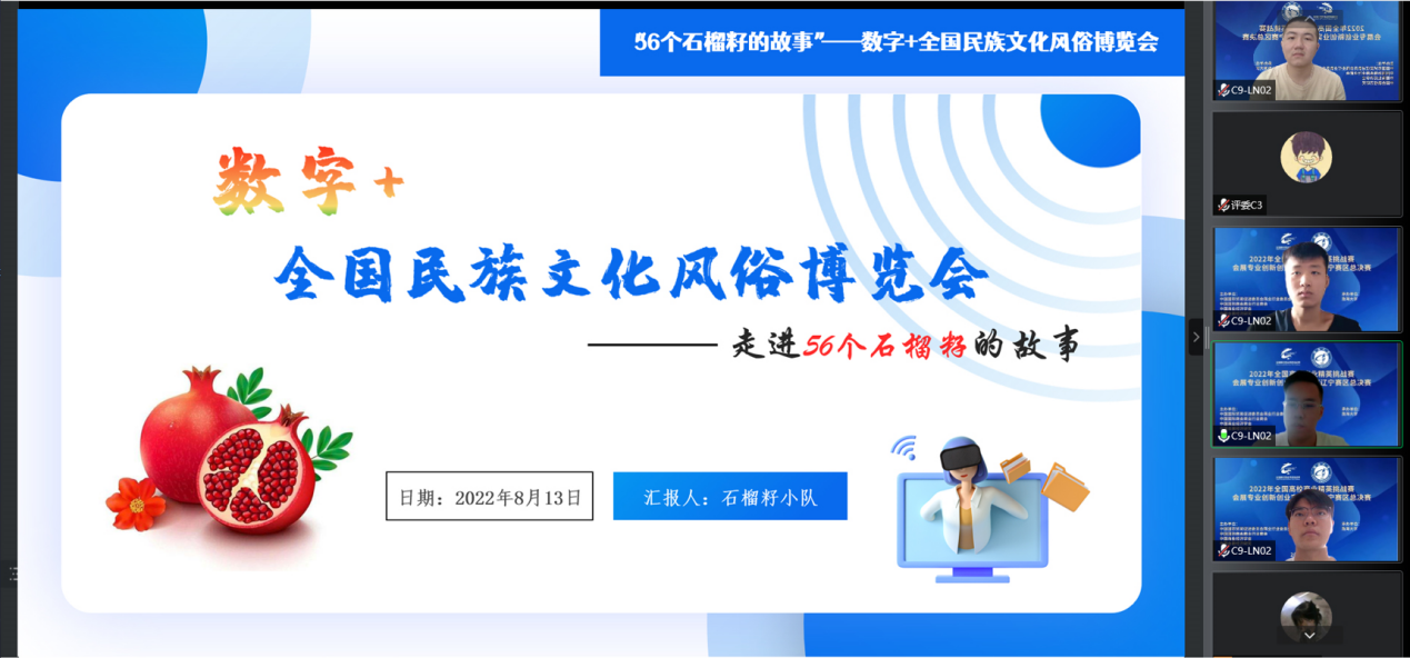 2022年8月13日,第十六届全国高校商业精英挑战赛会展专业创新创业实践竞赛辽宁赛区选拔赛于渤海大学成功举办。辽宁省共有25所院校3000余人报名参赛。结合当前疫情防控态势赛区总决赛在线上举行,经过专家网络评审,线上路演答辩角逐,共评出辽宁赛区学生组一等奖40个项目、二等奖46个项目、三等奖54个项目。来自我校的“石榴籽”团队在本次比赛中荣获辽宁省一等奖及辽宁省总决赛最佳人气团队奖。项目指导教师陈奡册、李航获辽宁赛区总决赛优秀指导教师奖。