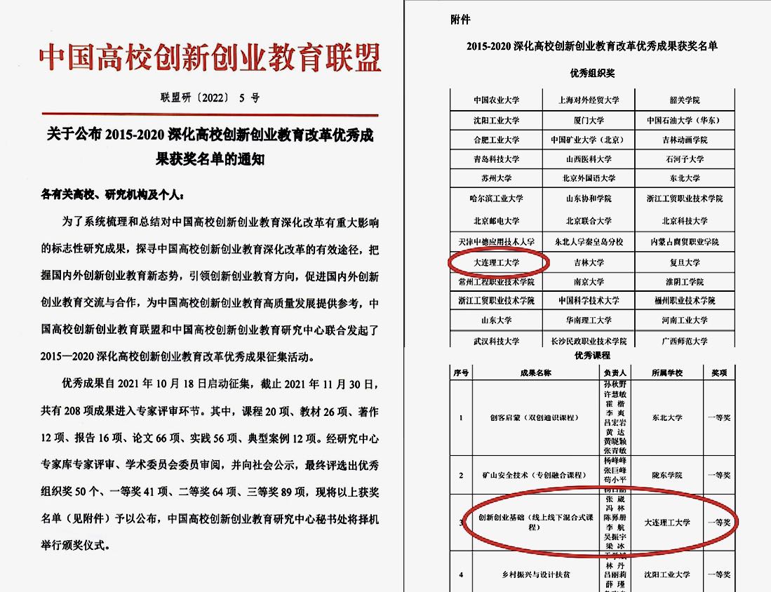 8月23日,中国高校创新创业教育联盟“关于公布2015-2020深化高校创新创业教育改革优秀成果获奖名单内”的通知【联盟研(2022)5号】,我校创新创业学院创新创业教育教研室张崴团队建设的线上线下混合式课程《创新创业基础》获优秀课程一等奖,张崴老师和冯林教授主编的《创意设计与专利保护》获优秀教材三等奖。我校获优秀成果组织奖。