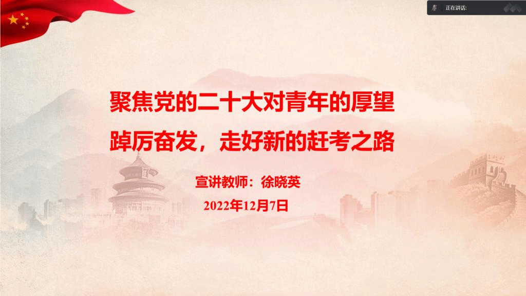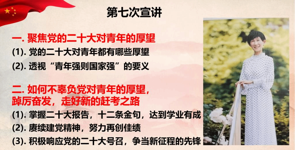 本次党课对帮助学生群体深入学习理解党的二十大精神具有良好的推动作用。这是徐晓英老师第七次开展党的二十大精神宣讲,与会同学们纷纷为这位积极奔走、认真宣讲党的二十大精神的老党员点赞。