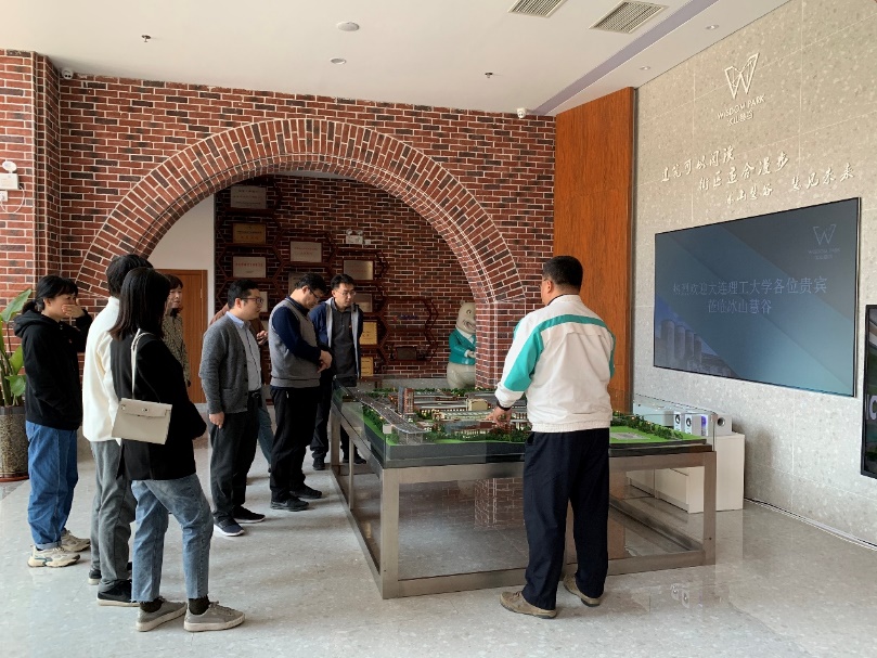 在冰山慧谷智慧创新产业园展示中心,支部一行人听取了冰山慧谷负责人对园区整体规划及改造建设情况的介绍,详细了解了园区功能定位及创新创业生态营造方案,对进一步合作开展大学生创新创业实践教学进行了沟通。
