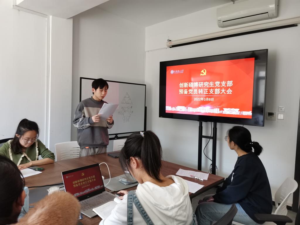 3月6日下午,创新硕博研究生党支部在学院409会议室召开了支部党员大会,讨论预备党员邓翔宇同志转正等问题。会议由支部书记宋莎同志主持。