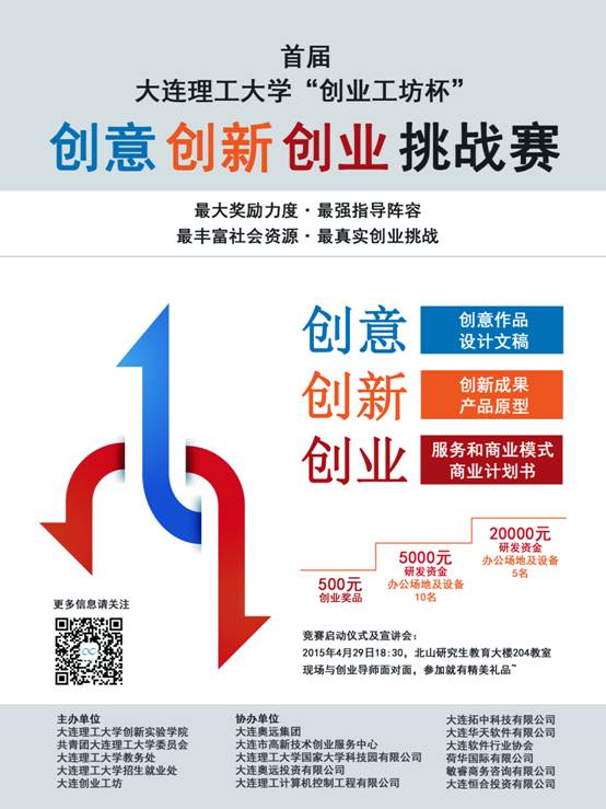 首届大连理工大学“创业工坊杯”创意创新创业挑战赛由大连理工大学创新实验学院、共青团大连理工大学委员会、大连理工大学教务处、大连理工大学招生就业处、大连创业工坊联合主办,是面向大连理工大学全体在校生的创意、创新、创业竞赛。该竞赛的目的是发现和培养一批有创造力、有创业激情的团队,引导和扶持一批有创新性、有市场前景的项目,激发学生创造力,鼓励创新实践,培养学生的创业意识和创业能力,营造我校大学生创新创业氛围,进一步完善人才培养路径。