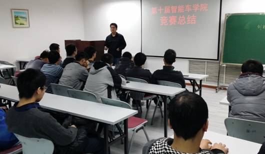 颁奖结束后,由李胜铭老师主持赛后的技术交流会。首先由取得好成绩的队伍进行了比赛心得分享,并对队伍所采用的软硬件方案进行介绍,最后是互动交流,各支队伍就自己感兴趣的内容及技术要点进行了积极热烈的讨论,老队员介绍了以往的参赛感受,其中陈江涛、李殊昭等同学所分享的控制策略分析、硬件设计方面该注意的要点让智能车成员们受益匪浅,智能车实验室班长王东旭对近阶段的工作做了汇总,对各车队目前的完成情况结合以往全国及赛区竞赛成绩作了分析,提出了针对性的技术方案实施建议,并对后续两周的工作做了具体要求和安排。