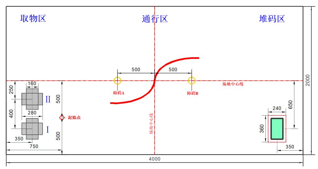 场地标识:包括中心线、起始点、障碍物、取物区外框、堆码区矩形框,采用白色车贴纸或胶带(可打印制作),胶带带宽约为10mm,需要保证取物区、堆码区的矩形框外边尺寸与图3绝对一致。