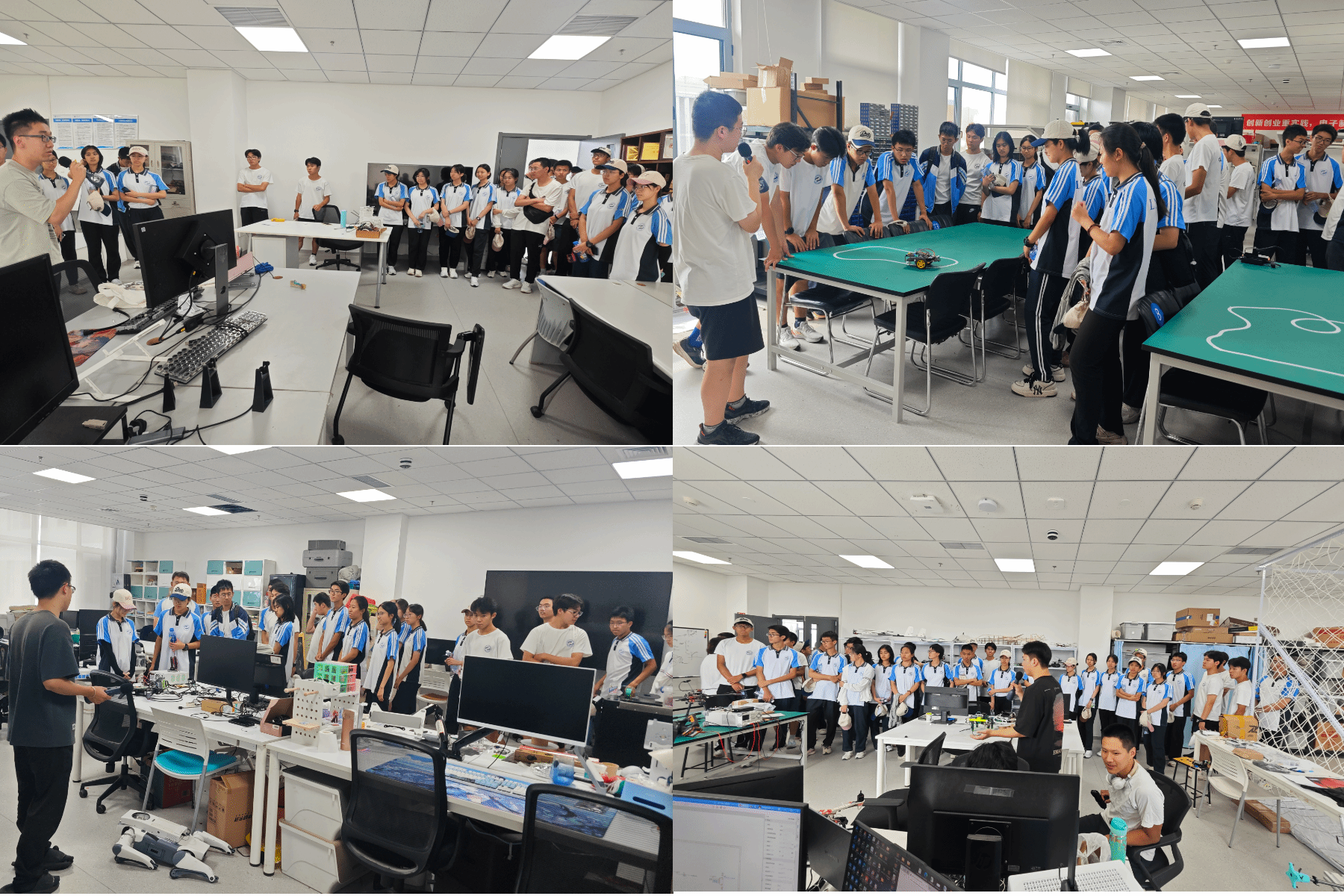 创新创业学院教师王义普、刘胜蓝、王飞龙和各实验室的同学接待了师生们的参观。同学们首先观看了学院的宣传片,了解了学院的历史沿革和在创新创业方面的丰硕成果,然后参观了无人机工坊、人工智能实验室、智能车实验室、机电创新实践班、深度学习实践班等多个创新创业实验室。