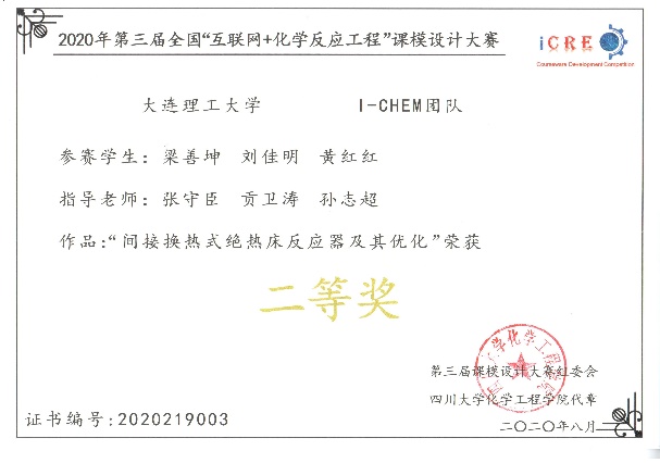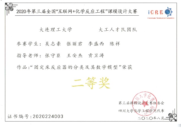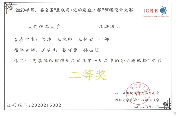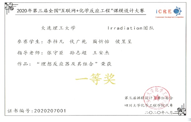 近日,由四川大学化学工程学院、华东理工大学化工学院、中国石油大学(北京)化学工程与环境学院和大连理工大学化工学院于2020年5月至7月联合举办的第三届全国“互联网+化学反应工程”大学生课模设计竞赛落下帷幕。我校四支参赛队伍在来自43所高校的163支参赛队伍中脱颖而出获得佳绩。其中由张守臣、孙志超、王安杰三位老师指导的Irradiation团队(队长:李梓凡,队员:蔺忻怡、侯昱呈、伏广乾)获得一等奖;由王安杰、张守臣、孙志超指导的足迹队(队长:徐沛,队员:于娜、王怀姣、王沈帅)、张守臣、贡卫涛、孙志超指导的I-CHEM队(队长:梁善坤,队员:刘佳明、黄红红)和张守臣、王安杰、贡卫涛指导的大工人才队(队长:吴志豪,队员:张丽君、李盛西、陈祥)三支队伍获得二等奖。
