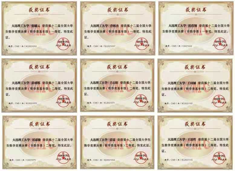 5月15日,第十二届全国大学生数学竞赛决赛在吉林大学举行。通过大连市大学生数学竞赛和辽宁省大学生数学竞赛(全国预赛)的选拔和全国决赛的激烈角逐,我校共有9名同学入围决赛并全部获奖。全国决赛分为数学类高年级、数学类低年级和非数学类三个组别。其中,经济管理学院2018级本科生沈浩翔荣获非数学类全国一等奖,数学科学学院2018级本科生张曦元、乔秋杰荣获数学类高年级组全国一等奖,有5人荣获全国二等奖、1人荣获全国三等奖。这是我校首次在专业组和非专业组均获一等奖,也是首次产生专业组两个一等奖。