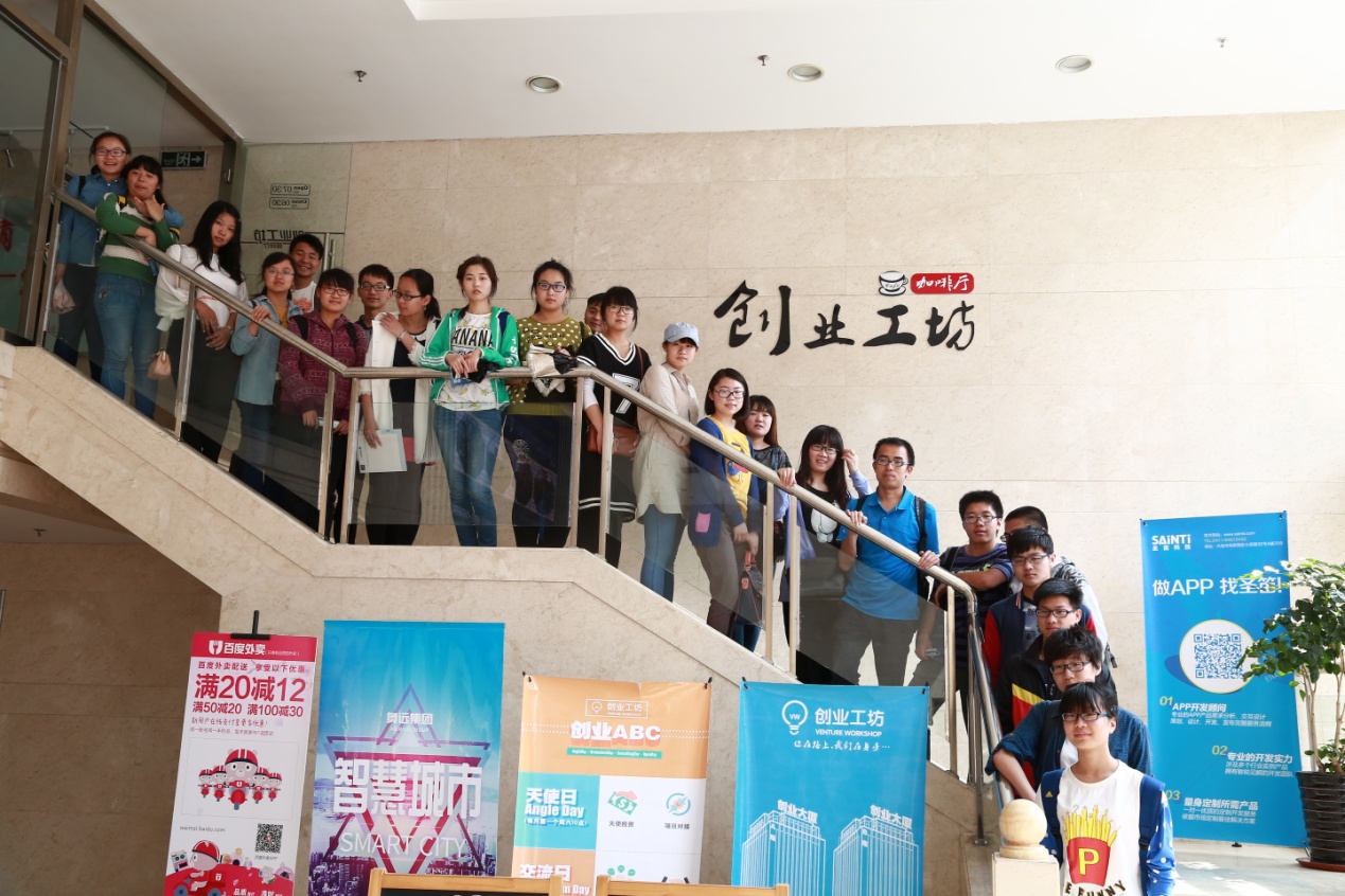 参观了创业苗圃之后,老师与同学们跟随创业工坊工作人员的脚步来到了位于创业大厦的创业工坊咖啡厅,在这里充分感受创业工坊的环境与文化。紧接着大家来到了位于创业大厦七楼的办公场所,参观了众多入驻创业工坊的公司,包括随车记等。